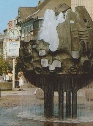 Der Brunnen wurde im Zusammenhang mit der Neugestaltung der Fußgängerzone errichtet. Vom Stifter aus gesehen vermutlich aus der Intention "Kunst am Bau". Der Bau begann 1979, eingeweiht wurde er 1980.